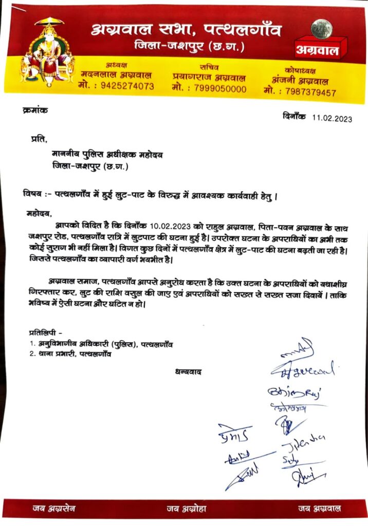 अग्र समाज के व्यापारियों ने लूट की घटना के मामले में पुलिस अधीक्षक के नाम सौंपा ज्ञापन