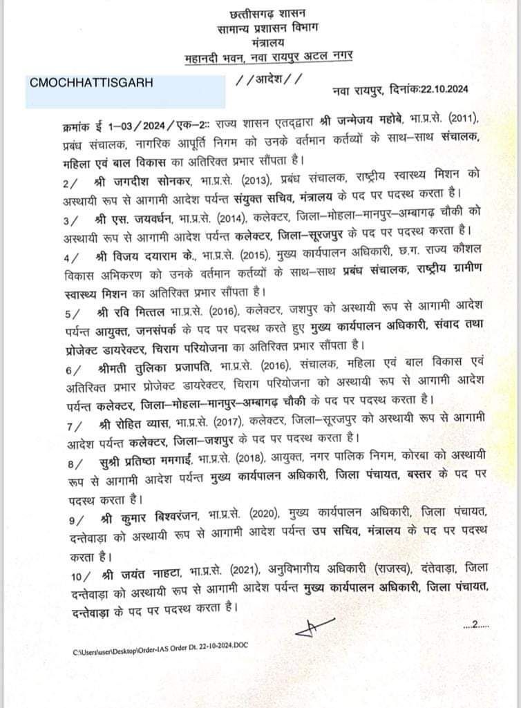 सीएम के गृह जिले का कलेक्टर बनाया गया है। मोहला-मानपुर कलेक्टर एस जयवर्धन को सूरजपुर का नया कलेक्टर बनाया गया है। तुलिका प्रजापति को मोहला- मानपुर का कलेक्टर बनाया गया है। जिन अफसरों जन्मेजय महोबे को महिला बाल विकास विभाग का संचालक बनाया गया है। जगदीश सोनकर को बिना विभाग में मंत्रालय में पदस्थ किया गया है। विजय दयाराम को प्रबंध संचालक राष्ट्रीय ग्रामीण स्वास्थ्य मिशन बनाया गया है। प्रतिष्ठा ममगाई को बस्तर जिला पंचायत का सीईओ बनाया गया है। कुमार विश्वरंजन को उप सचिव मंत्रालय पदस्थ किया गया है। जयंत नाहटा को सीईओ जिला पंचायत दंतेवाड़ा पदस्थ किया गया है।