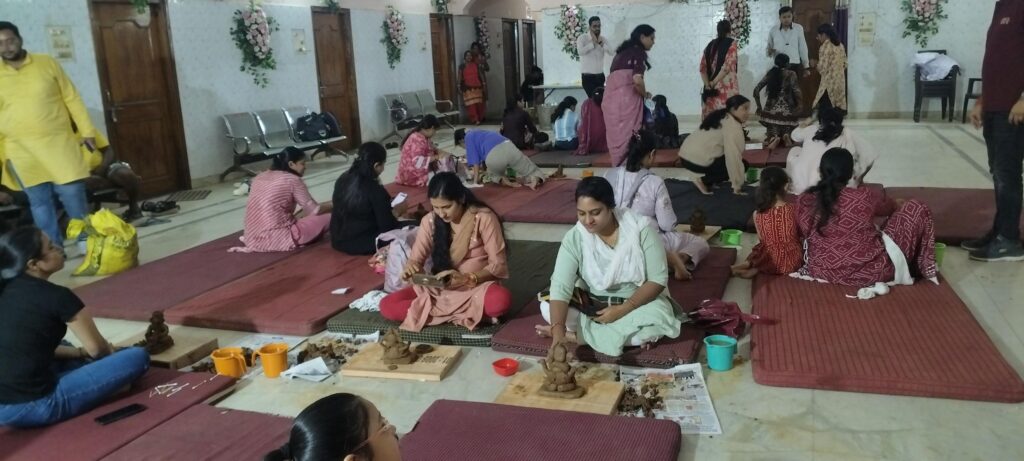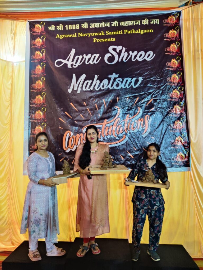 आज की बहुत अच्छी प्रतियोगिता में मिटी से गणेश बनाओ रही जिसमें काफी संख्या में महिलाओं एवं बच्चों ने भाग लिया ,जिसमें प्रथम पायल राजीव गर्ग,द्वितीय खुशी सुनील अग्रवाल,तृतीय स्थान में आंचल सिद्धांत अग्रवाल रहे,सभी में एक से बढ़कर एक गणेश जी की मूर्ति बनाई थी ,निर्णायकों को निर्णय लेने में काफी मशक्कत करनी पड़ी।