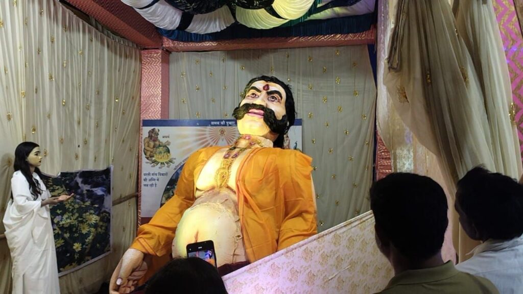 वहीं केंद्र पर यंत्र चालित कुंभकर्ण की प्रतिमा भी लगाई गई है। जो कि अज्ञान की नींद में सोए हुए मस्तिष्क का प्रतीक है। इसे जगाने के लिए इलेक्ट्रानिक विधि के साथ ही लाइट और साउण्ड का समायोजन भी किया गया है। नीलू बहन ने बताया कि आधुनिक होने के बावजूद आज का मानव मन भी कुंभकर्ण की भांति नाना प्रकार की भ्रांतियों से जकड़ा हुआ है। कुंभकर्ण की प्रतिमा को जगाने की प्रक्रिया के माध्यम से अज्ञान के अंधकार में डूबे लोगों को ज्ञान के प्रकाश से आलोकित करने का प्रतीकात्मक प्रदर्शन किया गया ।जो लोगों के लिए कौतूहल का विषय बनी हुई है।