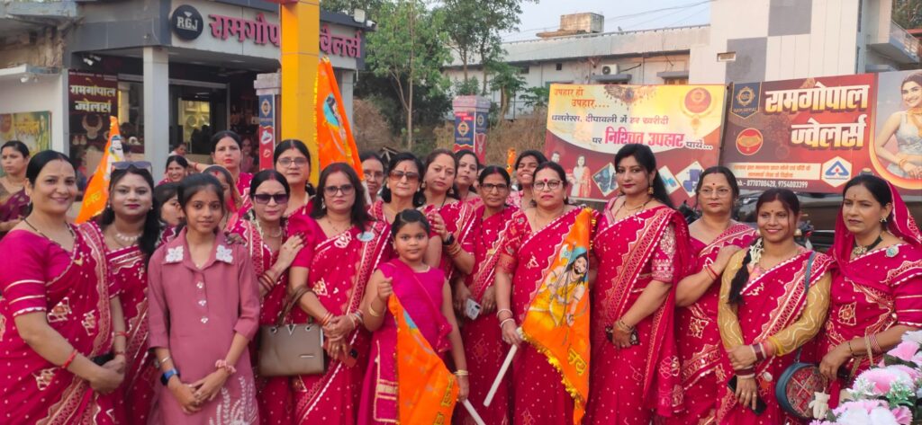 शोभायात्रा की खास बात रही महिलाओं की मनमोहक उपस्थितिकृएक जैसी साड़ी में सुसज्जित महिलाओं की कतारें मानो आस्था की जीवंत झांकी बन गईं। उनकी आकर्षक वेशभूषा और अनुशासित सहभागिता ने हर किसी का ध्यान अपनी ओर खींचा। कार्यक्रम की शुरुआत विधिवत आरती के साथ हुईए जिसके बाद